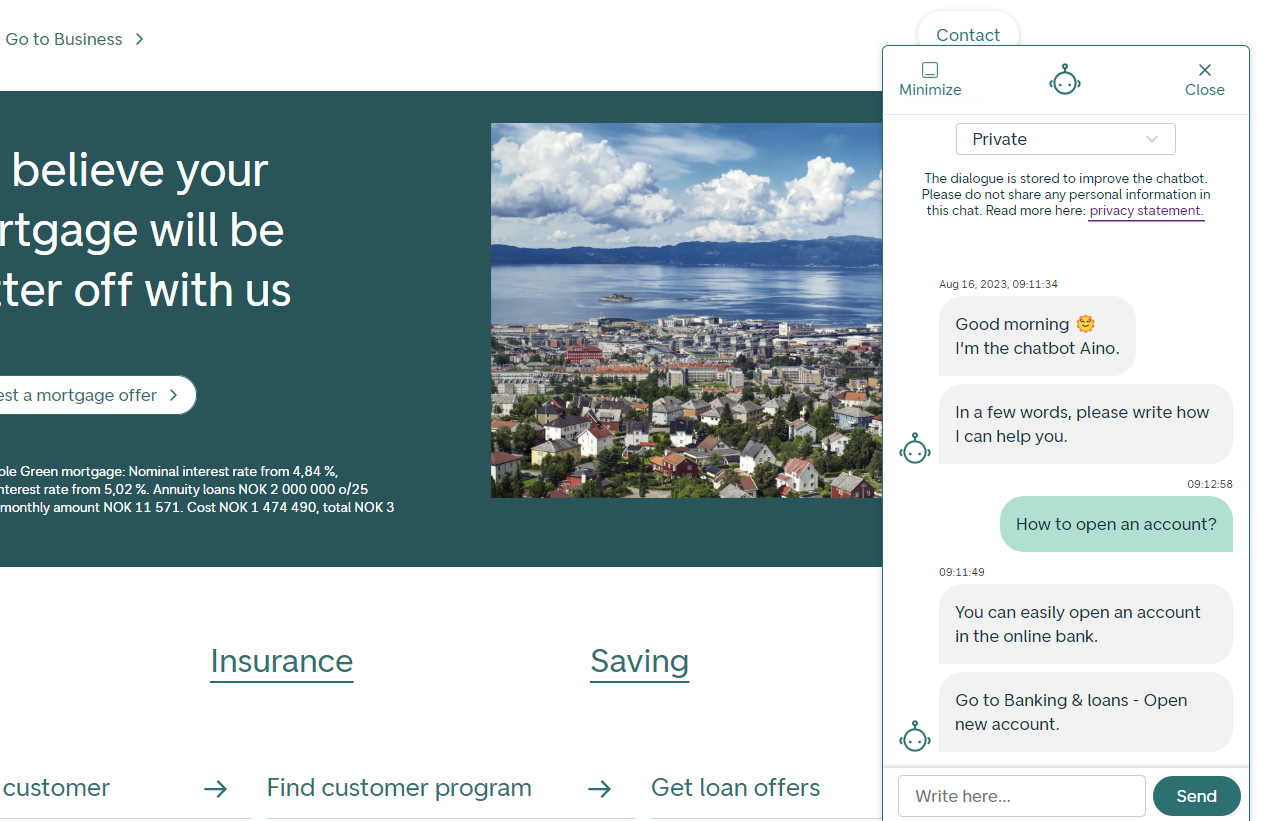 Banka DNB se je soočala z naraščajočim prometom prek vhodnih klepetalnih pogovorov na svojem spletnem mestu in želela svojim strankam zagotoviti podporo 24/7 ter razbremeniti zaposlene ponavljajočih se vprašanj in opravil.Banka se je povezala s podjetjem Boost.ai in ustvarila Aino, klepetalnega robota, ki ga poganja umetna inteligenca, za bančništvo z naprednimi zmogljivostmi, ki presegajo običajne klepetalne robote.