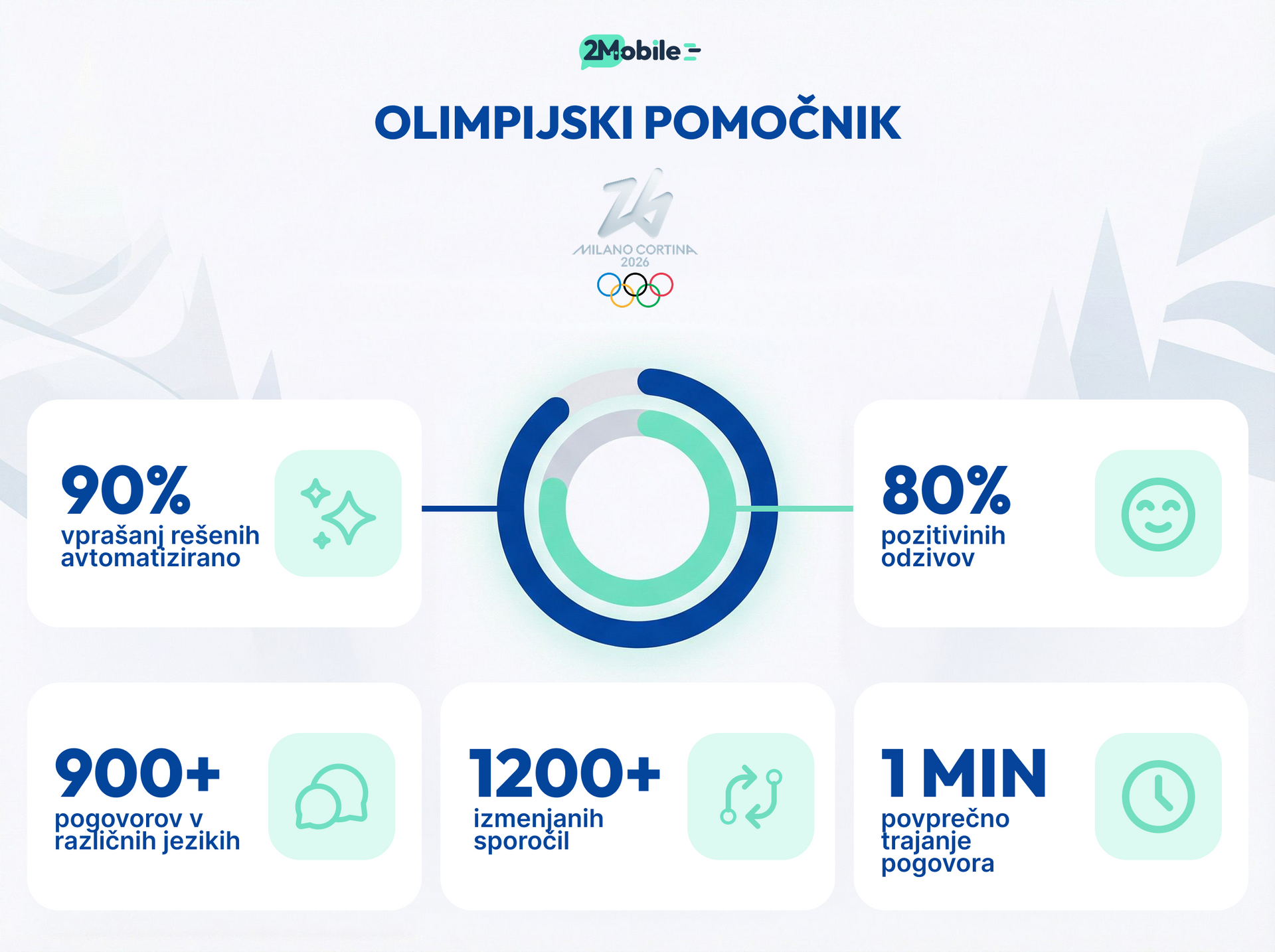 2Mobile je za Olympic.si (Olimpijski komite Slovenije) razvil Olimpijskega pomočnika, ki je deloval 24/7 na podstrani Milano Cortina 2026 med 6. in 22. februarjem 2026.